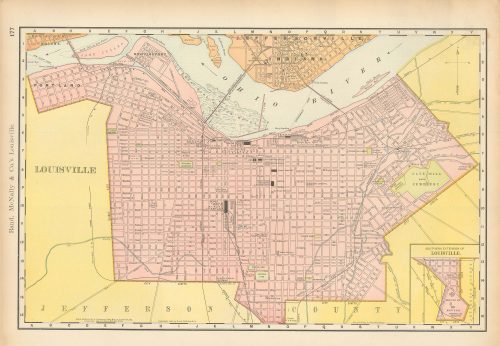 Art Source International has amassed a collection of authentic antique maps and images brilliantly highlighting and detailing the city of Louisville, Kentucky, the most populous city in the state, which is located along the border between Kentucky and Indiana and the Ohio River. Points of interest for the city include the Mega Cavern, the Big Four Bridge, Cherokee Park, and Churchill Downs. The city is home to the Belle of Louisville, a steamboat first launched in 1914 that is now recognized as the oldest river steamboat in operation, and a National Historical Landmark. Louisville was founded in 1778, making it one of the oldest cities west of the Appalachians. Art Source International reproductions and vintage maps can be ordered framed or without a frame.