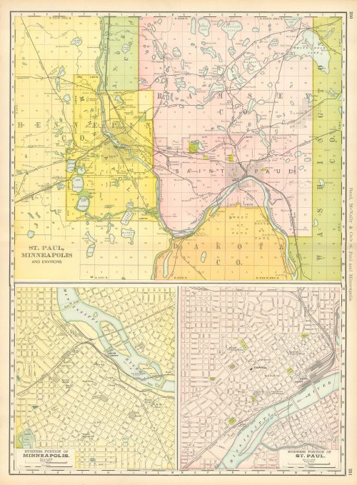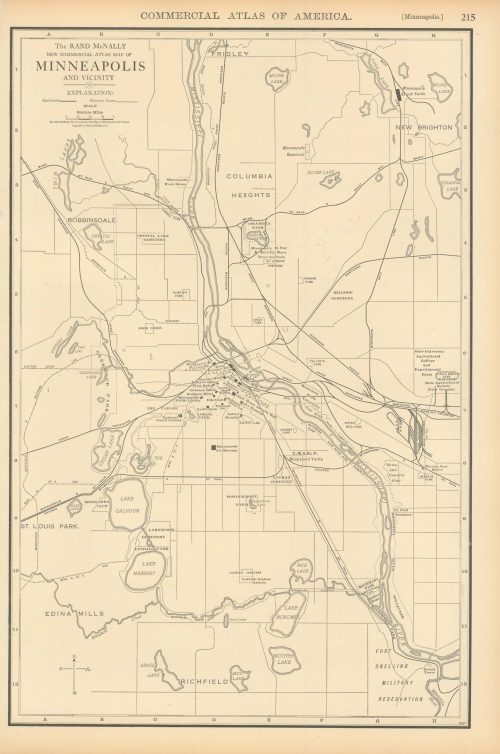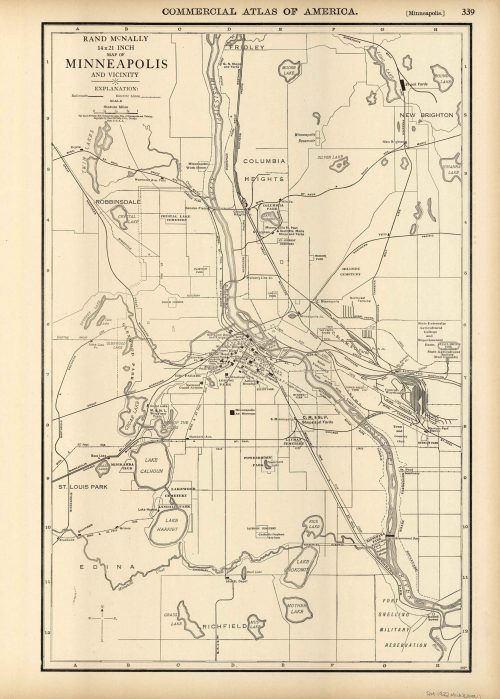 Art Source International has amassed a collection of authentic antique maps and images brilliantly highlighting and detailing the city of Minneapolis, Minnesota, which is bisected by the Mississippi River and neighbors the city of St. Paul. Minneapolis and St. Paul form the Twin Cities. The city has one of the most extensive public park systems in the United States with many of these parks being connected by the Grand Rounds National Scenic Byway. Points of interest for the city include Minnehaha Falls, the Basilica of Saint Mary, Mill Ruins Park, and the Mall of America. Art Source International reproductions and vintage maps can be ordered framed or without a frame.
