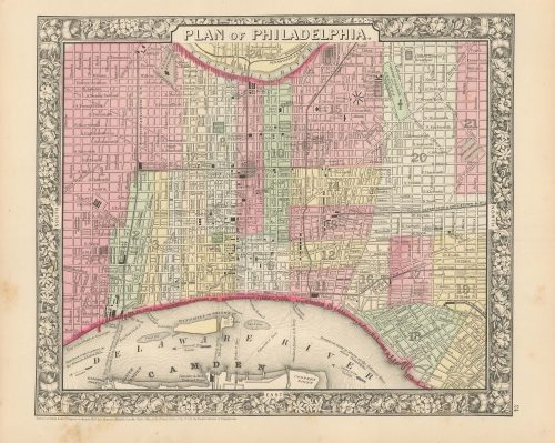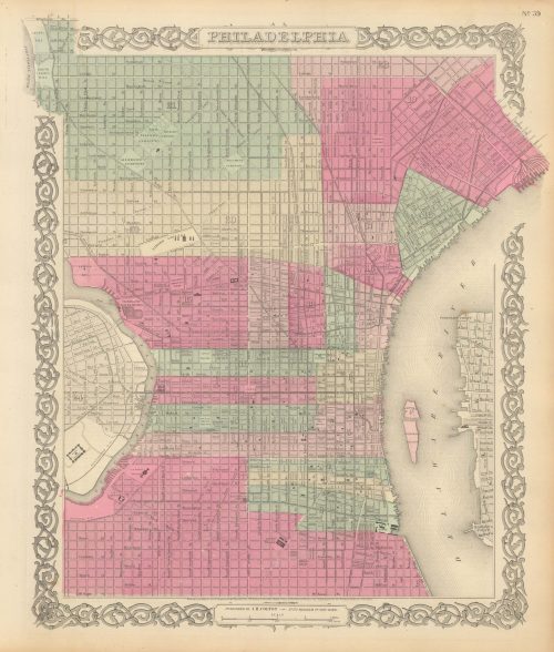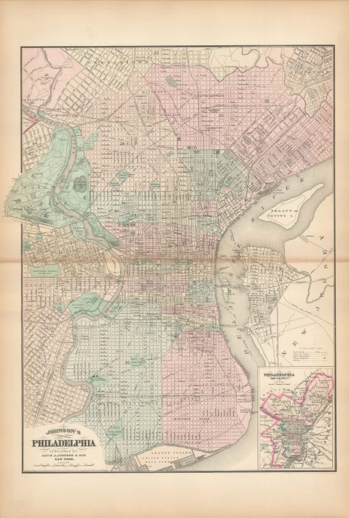 Art Source International has amassed a collection of authentic antique maps and images brilliantly highlighting and detailing the city of Philadelphia, Pennsylvania on the East Coast of the United States with close neighboring states New York, New Jersey, and Delaware. Philadelphia is historically significant with both the Declaration of Independence and the Constitution having been signed there. Philadelphia, the City of Brotherly Love, has seen both the Revolutionary War and the Civil War. The city has amazing points of interest like the Liberty Bell, Independence Hall, and the Betsy Ross and Benjamin Franklin houses. Historic railroads head west from Philadelphia through the beautiful Appalachian Mountains, Alleghany Mountain Range, and the Pocano Mountain Range westward through Pittsburgh, Harrisburg, and beyond. Art Source International reproductions and vintage maps can be ordered framed or without a frame.