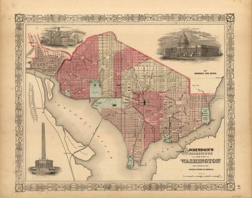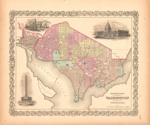 Art Source International has amassed a collection of authentic antique maps and images brilliantly highlighting and detailing the city of Washington D.C., otherwise known as the District of Columbia, which borders Maryland and the east bank of the Potomac River, which shares a border with Virginia. The city is the capital and federal district of the United States and was founded in 1790. Points of interest for the city include the United States Capitol Building, the Lincoln Memorial, Washington Monument, the White House, and the Library of Congress. Washington D.C. was named after the first president of the United States, George Washington. Art Source International reproductions and vintage maps can be ordered framed or without a frame.