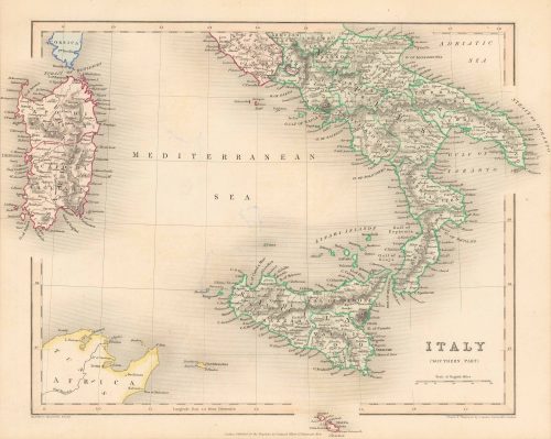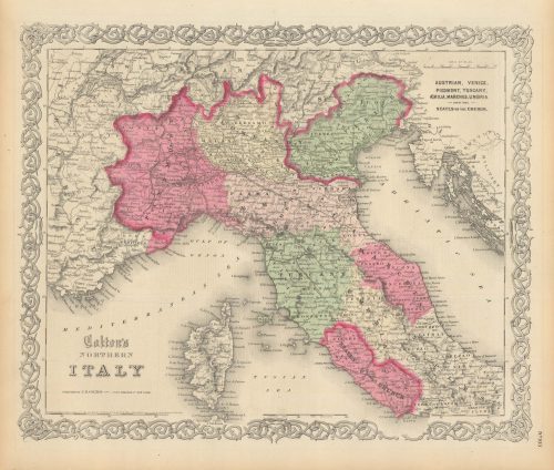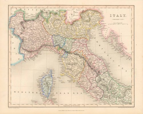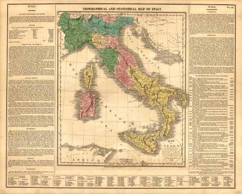 Art Source International has amassed a collection of authentic antique maps and images brilliantly highlighting and detailing the country of Italy, which borders France, Switzerland, Austria, Slovenia, and the Mediterranean Sea. The country’s highest point is located on Mont Blanc within the Alps mountain range. Italy is home to the two biggest islands within the Mediterranean, Sicily and Sardinia. The Po River is the longest within the country at 405 miles long. Mount Etna in Sicily is the largest active volcano in Europe. Art Source International reproductions and vintage maps can be ordered framed or without a frame.