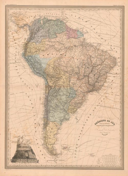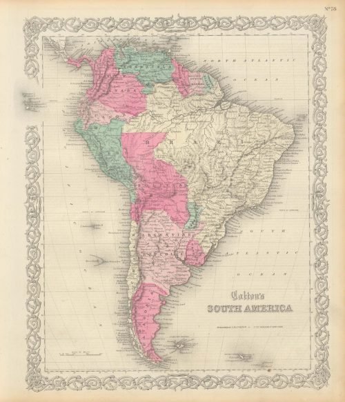 Art Source International has amassed a collection of authentic antique maps and images brilliantly highlighting and detailing the continent of South America, which is bordered by the Pacific Ocean, the Atlantic Ocean, North America, and the Caribbean Sea. The continent is fourth-largest in area and fifth in population. South America is home to the largest river by volume, the Amazon River and the longest mountain range, the Andes. Art Source International reproductions and vintage maps can be ordered framed or without a frame.