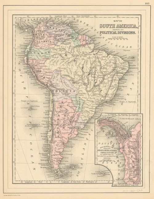 Map of South America showing its Political Divisions (with an inset map showing the proposed Atrato-Inter-Oceanic Canal Routes, for connecting the Atlantic and Pacific Oceans)