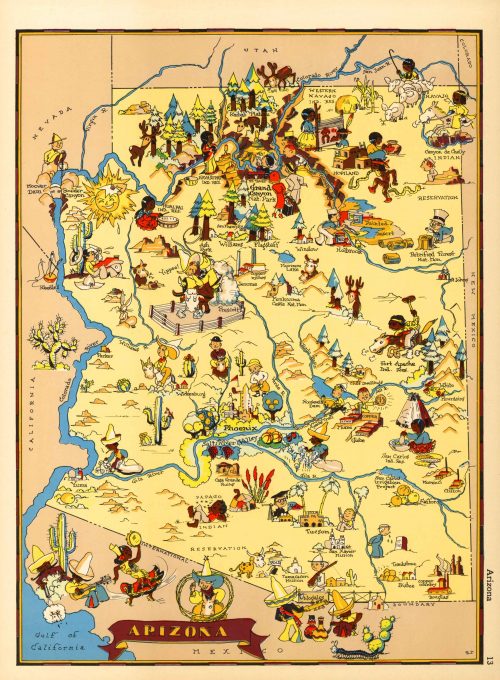Art Source International has amassed a collection of authentic antique maps and images brilliantly highlighting and detailing the state of Arizona, which borders California, Nevada, Utah, New Mexico, and Mexico. The state is best known for it’s scenic landscapes, particularly in Grand Canyon National Park (considered one of the seven great natural wonders of the world) and Saguaro National Park. Grand Canyon National Park encompasses 278 miles of the Colorado River and became one of the first established National Parks when designated by Teddy Roosevelt in 1908. About one-quarter of Arizona is made up of reservations that serve as the home of 27 federally recognized Native American tribes such as the Navajo Nation, which is the largest in the state and the U.S. Art Source International reproductions and vintage maps can be ordered framed or without a frame.