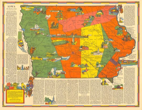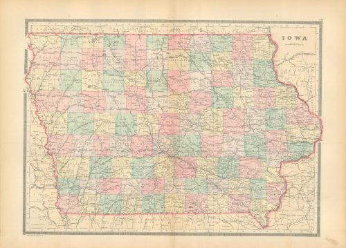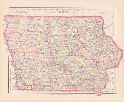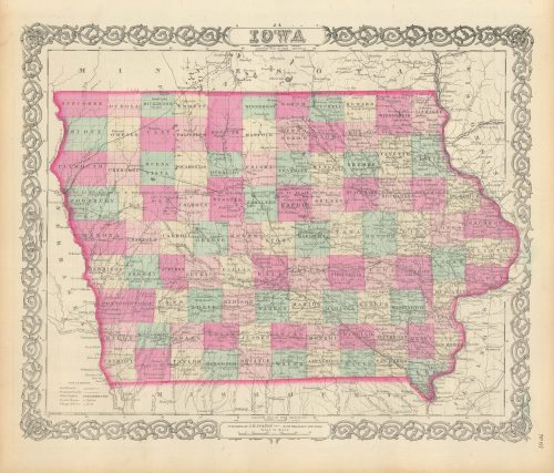 Art Source International has amassed a collection of authentic antique maps and images brilliantly highlighting and detailing the state of Iowa, which borders Minnesota, Wisconsin, Illinois, Missouri, Nebraska, and South Dakota. The Missouri river separates the state from Nebraska, the Big Sioux River separates it from South Dakota, and the Mississippi river separates it from Illinois and Wisconsin. Iowa was admitted to the Union on December 28, 1846, as the 29th state. Art Source International reproductions and vintage maps can be ordered framed or without a frame.
