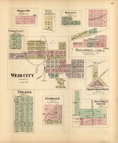 L.H. Evert’s 1887 Map of Stippsville, Messer, Wonsivu, Cedar Point, Hallowell and Lola, Weir City, Toledo, Elmdale, and Crawfordsville, Kansas