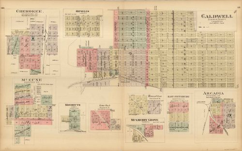 L.H. Evert’s 1887 Map of Caldwell, Cherokee, Opolis, McCune, Monmouth, Lone Oak, Mulberry Grove, Brazelton, East Pittsburg, and Arcadia, Kansas