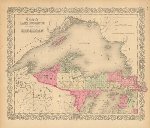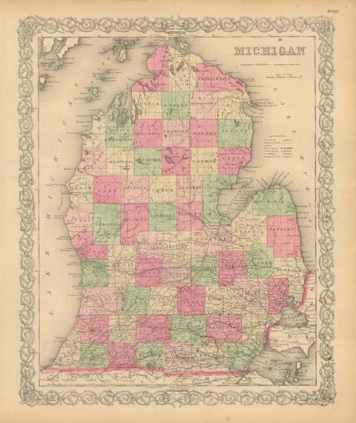 Art Source International has amassed a collection of authentic antique maps and images brilliantly highlighting and detailing the state of Michigan, which borders Wisconsin, Indiana, Ohio, the Canadian province of Ontario, Lake Superior, Lake Michigan, Lake Huron, and Lake Erie. Points of interest in the state include the Porcupine Mountains, which are part of one of the oldest mountain chains in the world, and Isle Royale National Park. Michigan has 78 state parks and six state forests, making it the state with the largest state park and state forest system. The largest city in the state is Detroit, known for being a major port on the Detroit River, being home to auto manufacturers General Motors, Ford, and Stellantis North America (Chrysler), and it’s diverse culture and arts scene, which gave rise to the musical genres of Motown and techno. Art Source International reproductions and vintage maps can be ordered framed or without a frame.