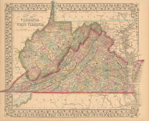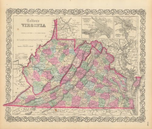 Art Source International has amassed a collection of authentic antique maps and images brilliantly highlighting and detailing the state of Virginia, which is bordered by Washington DC, Maryland, West Virginia, Kentucky, Tennessee, and North Carolina in the East Coast region of the United States of America. Richmond and Virginia Beach are the primary cities which have seen many historically significant events, with the Civil War, Colony of Virginia, Jamestown, the Thirteen Colonies, and the American Revolutionary War being potentially the most important. The amazing points of interest like Appalachian Mountains, Blue Ridge Mountains, the Allegheny Mountains, and Atlantic Coast can be seen by railroad train, auto, or boat. Art Source International reproductions and vintage maps can be ordered framed or without a frame.