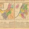 This beautiful map, illustrative of Sacred History, came from M. Lavoisnes Genealogical Historical Chronological and Geographical Atlas. The two maps show “Canaan, with Part of Egypt, during the Residence of the Israelites in the Desert” and “Canaan, subsequent to its Conquest by the Israelites, and its Division among the Tribes”. Below the maps contain important historical information. This map is accompanied by 3 pages of hand-colored historical tables.
