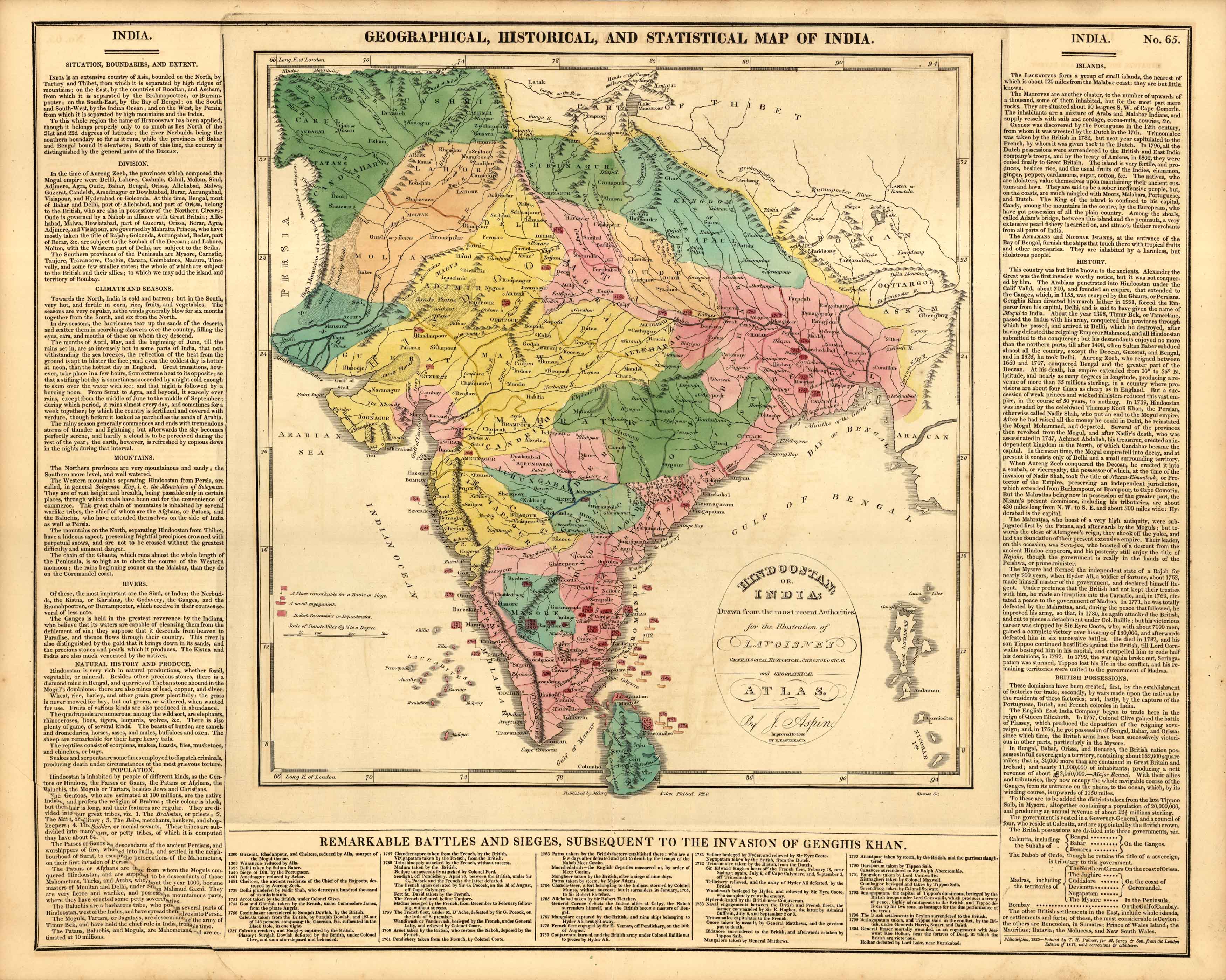 This beautiful and historical map of India came from M. Lavoisnes Genealogical Historical Chronological and Geographical Atlas. Surrounding this brightly colored map is important textual information on geography, history, British possessions, sites of battles or sieges, and includes notes such as “High Mountains of hard Rock” and “Great Desert subject to burning winds”. ‘