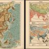 This map was produced for the 1902 Diercke, Schul-Atlas fur Hohere Lehranstalten, (Diercke Education Atlas for Higher Educational Institutions) This atlas was prepared and issued by C. Diercke and E.Gaebler for the Westermann publishing group in Braunschweig. With the help of fellow cartographer, Eduard Gaebler, Carl Dierckes maps became a staple in the geography classrooms in Germany. From 1893 until his death, Diercke was editor of all the maps for Westermann Verlag. All text is in German with full color that has remained quite bold. A wonderful example of the fine German engraving work of the time. These beautiful, topographic maps show the physical attributes and contours of the land as well as identifies cities, countries, rivers, mountains, boundaries, and more. They are double sided maps (shown side by side in image) which have corresponding information to the country on the opposite side. This map shows Asia on one side and has four smaller maps on the other regarding: Temperaturkarte (Temperature), Meeresgebiete (Marine Areas), Regenkarte (Rainfall), Vegetationsgebiete (Vegetation).
