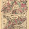 This finely detailed double-page map came from Johnsons New Illustrated (Steel Plate) Family Atlas. Map shows cities and towns, rail lines, rivers and lakes, and wagon trails/roads. Each region is individually colored, and includes the traditional decorative border. This is two maps in one! Includes inset maps of Montreal, Wolf Island and Welland Canal. ‘