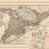 This map of Ontario (with an inset map of Manitoba, Dominion of Canada) was made by S. Augustus Mitchell for “Mitchells New General Atlas” published in 1888, by WM. M. Bradley & Co. The well maintained maps in this atlas feature Mitchell’s characteristic pastel coloring and abundant details of geographical features. Details include the names of counties, cities, towns, transportation routes, mountain ranges, rivers and lakes. These 1888 maps offer a fascinating perspective of areas that have since undergone significant growth and change, in addition to their value as great examples of Mitchell’s work.