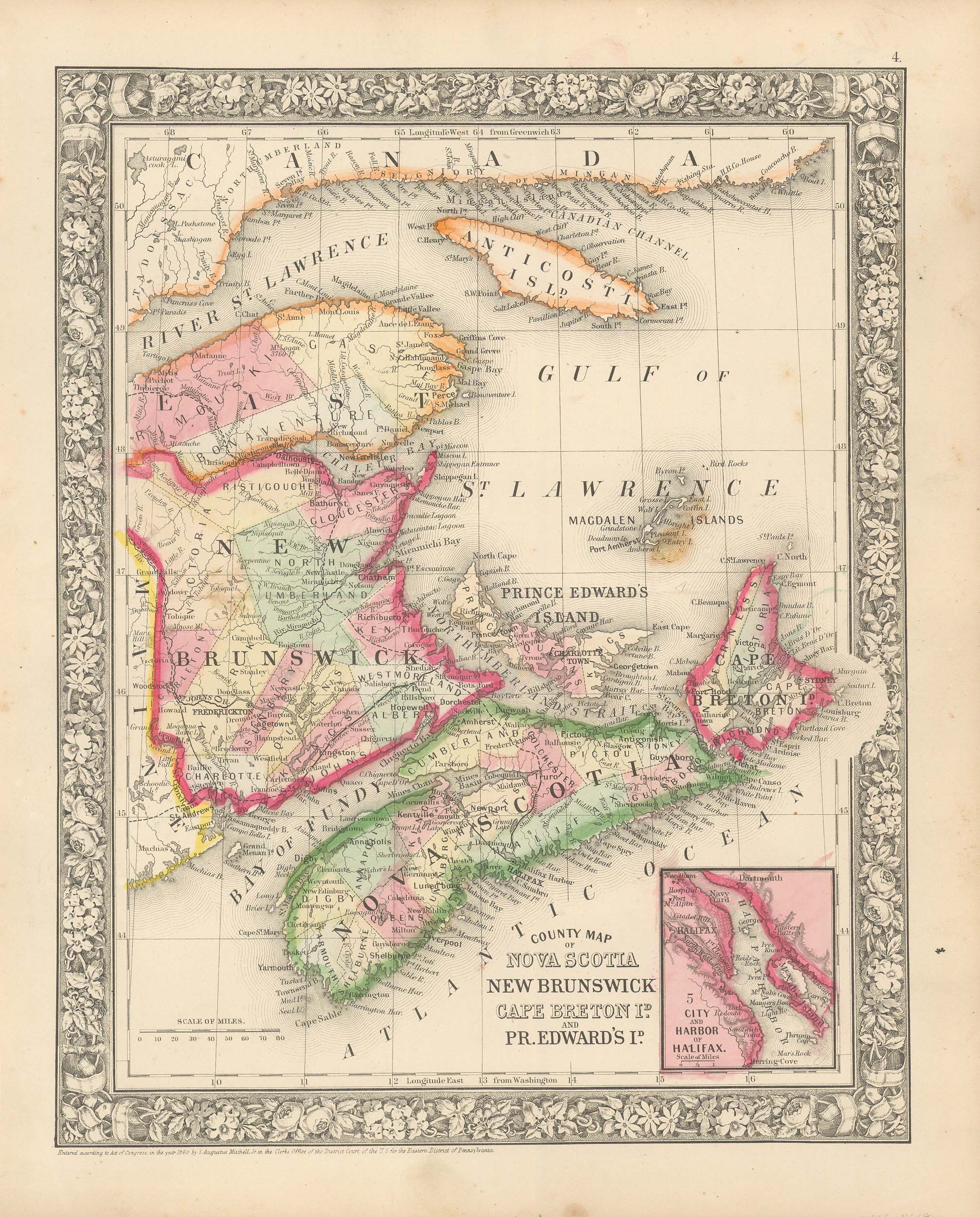 Mitchell’s 1865 County Map of Nova Scotia, New Brunswick, Cape Breton Island, and Prince Edward Island