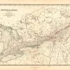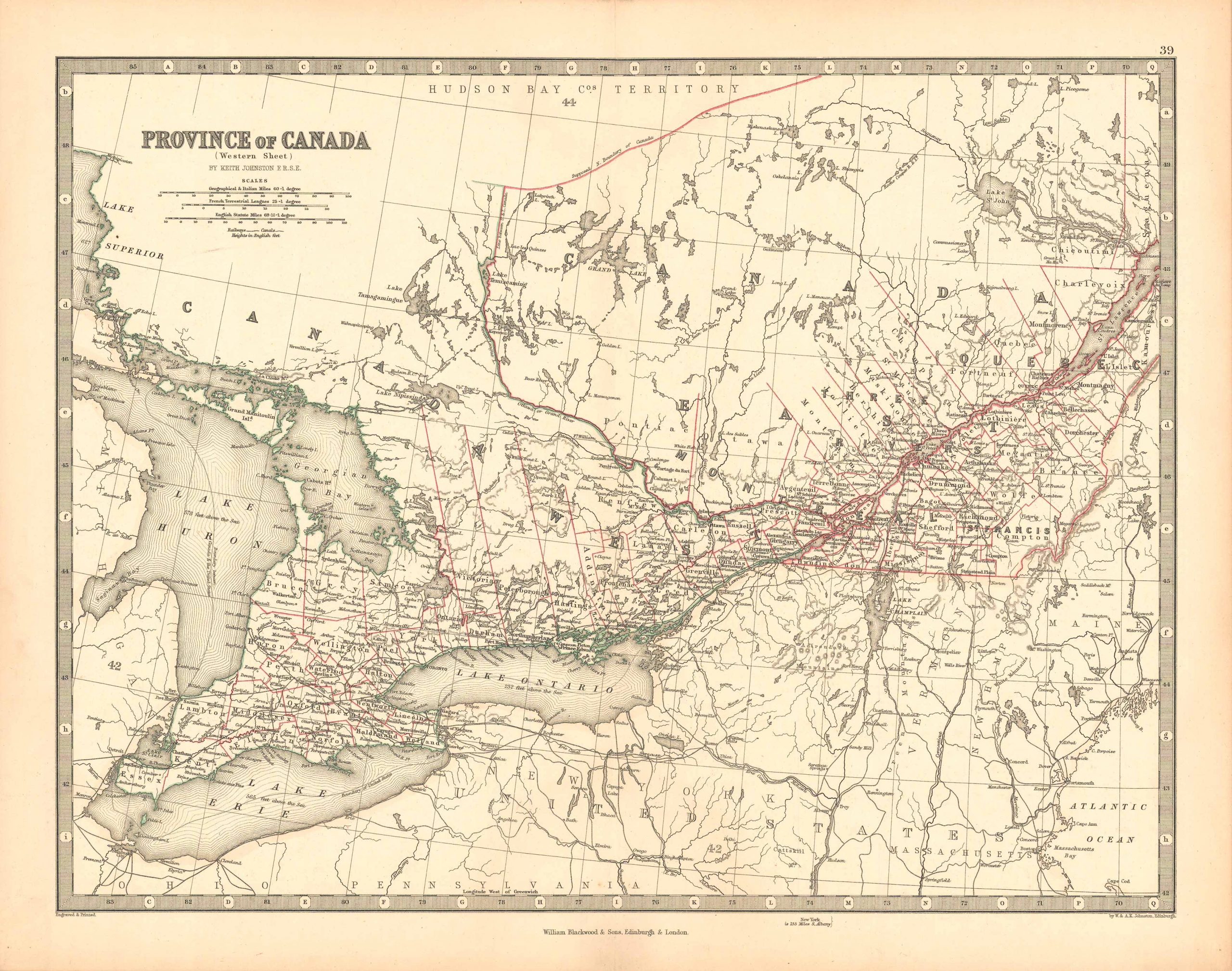 Alexander Keith Johnston took the title Geographer at Edinburgh to the Queen when he began map-making in Scotland in 1826. Johnston, famous for his attention to geographic detail, made this rare edition of the “Handy Royal Atlas of Modern Geography” in 1868. The Province of Canada ( Western Sheet )is illustrated on this hand colored map. Details include the names of regions, rivers, lakes, mountains, important cities and state borders. Each large scale map was printed on thick paper with vibrant color highlighting borders.