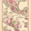 This antique map came from Johnsons New Illustrated (Steel Plate) Family Atlas, published in 1867, by A.J. Johnson. These maps are some of the most colorful and accurate maps produced in the 1860’s, their attention to detail and the fine steel engraving make them works of art. Johnson maps are characterized by hand coloring in red, green, yellow, and pink and distinctive borders, including iron scrollwork and a Celtic design. This beautiful map of Mexico and Central America shows countries, states and or provinces and regions, cities and towns, lakes, rivers, and water bodies, railroads, forts, and wagon trails. A fine piece that would make a nice addition to any wall in a home or office. Includes numerous inset maps of several regions and cities.