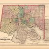 Art Source International is proud to offer this map from the 1857 edition of Coltons General Atlas. Colton atlases, especially those from the late 1850’s, have become increasingly rare. The General Atlas was the first single edition atlas published by the Colton brothers succeeding the expensive two volume Atlas of the World. The Colton firm refused to compromise quality, choosing to compete for sales in the finer quality international market rather than the cheap domestic one. Because of this, all maps were engraved by steel plates rather than by wax engraving which was the most common method used at this time. This city map of Baltimore is very detailed. It shows streets (named), railroads, parks, lakes and rivers, squares, government and public buildings, hospitals, and jails. Muted pastel coloring in pink, blue, green, and yellow.