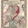 The Mitchell company was one of the first to try out the new technique of engraving on steel plates experimenting with steel almost 20 years before the rest of the publishing industry. He was printing with steel in the early 1830s; the general switch to steel was approximately 1850. During the early years of the company, Mitchell published mainly maps and travel guides. In 1860, Mitchell started producing “Mitchell’s New General Atlas”,and Mitchell Sr. retired and turned the business over to his sonof the same name. The New General Atlas was published until1893. Today Mitchell maps are sought after for their fine engraving, bright coloring, and attention to detail. They aresome of the finest maps produced during this time period. This map produced in 1866, has Mitchell’s unique floral border, and beautiful hand coloring. This map details Boston including Charlestown, East Cambridge, East Boston, South Boston with an inset map of Boston Harbor. Counties, cities, towns, lakes, rivers, mountains, and transportation routes are noted. Each map was printed on thick paper with vibrant hand color.