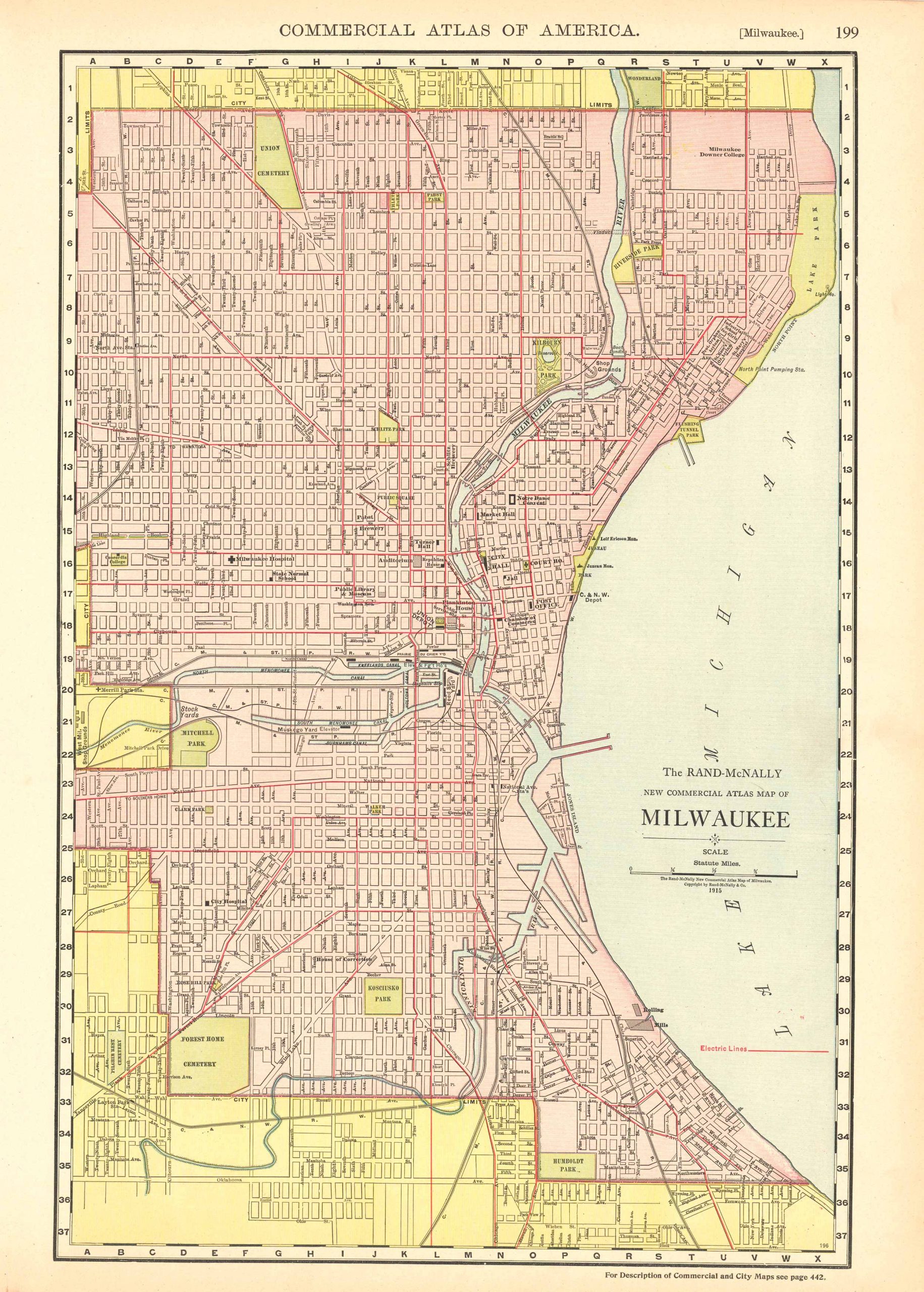 This map of Milwaukee was produced by Rand McNally and Co. as part of its Commercial Atlas of America. These maps are some of our favorite maps because of the large size of each map. The detail shown on each map is exceptional because of the map size. These maps were intended to be used by business for shipping and other uses. Roads, railroads, rivers, and buildings are clearly shown. There is more detail on these maps than any others during this time period.