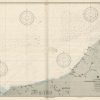 This coastal survey was printed by the U.S. Navy Hydrographic Office in Washington D.C. Details include the names of cities and waterways along the coast. Depth soundings are shown in fathoms. Other details that maybe included are lighthouses and buoy positions.