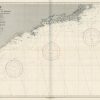 This coastal survey was printed by the U.S. Navy Hydrographic Office in Washington D.C. Details include the names of cities and waterways along the coast. Depth soundings are shown in fathoms. Other details that maybe included are lighthouses and buoy positions.