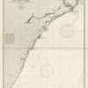 This coastal survey was printed by the U.S. Navy Hydrographic Office in Washington D.C. Details include the names of cities and waterways along the coast. Depth soundings are shown in fathoms. Other details that maybe included are lighthouses and buoy positions.