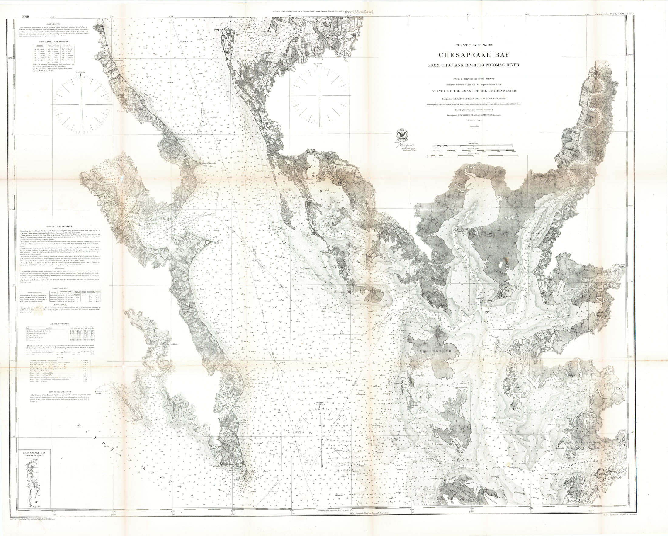 This coastal survey of Chesapeake Bay was made in 1862 by the Coast Survey Office. The section of the coast from the mouth of the Choptank River to the Mouth of the Potomac River is shown on this map. Details include depth readings and the names of cities and islands along the river. Notes on the map provide sailing instructions, and information on tides and currents.