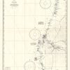 This coastal survey was printed by the U.S. Navy Hydrographic Office in Washington D.C. Details include the names of cities and waterways along the coast. Depth soundings are shown in fathoms. Other details that maybe included are lighthouses and buoy positions.