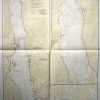 This coastal survey was made in Washigton D.C. by the U.S. Coast and Geodetic Survey on February 7, 1945.New London Harbor and the vicinity in Connecticut is illustrated on this map. A large inset shows New London to the Naval Reservation at a larger scale than the main map. Details include depth readings, the names of important cities along the coast, some important buildings, railroads, topography near the water, and major roads. Most recent Corrections, pipeline and cable areas, bouys, beacons, and lights are stamped on the map Notes on the map read: Warning: Aids to navigation may be altered, interrupted or removed without notice. In general, temporary changes due to war conditions are not incorporated on the chart. Caution Improved Channels- The side limits of the improvement are shown by broken lines. The controlling depth through the channel, on the date given, is placed in or alongside the channel, or in a seperate note, but no depth greater than the project depth is given. Because of possible shoaling, particularly at the edges, it must not be inferred that the depth stated exsisted throughout the entire width of the improvement on the date of the examination unless so stated, or that it has not since decreased in places across the entire width. Defensive Sea Area The Waters within the indicated limits o this chart are part of a Defensive Sea Area. Unless proceeding under United States naval supervision, vessels shall not be navigated in this area except during daylight under conditions of good visibility, and then only by specific permission. Vessels opperating under United States Naval orUnited States Coast Guard routing instructions or licenses are considered to be opperating under United States naval supervision.