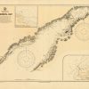 This coastal survey was printed by the U.S. Navy Hydrographic Office in Washington D.C. Details include the names of cities and waterways along the coast. Depth soundings are shown in fathoms. Other details that maybe included are lighthouses and buoy positions.