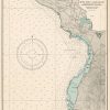 This coastal survey was printed by the U.S. Navy Hydrographic Office in Washington D.C. Details include the names of cities and waterways along the coast. Depth soundings are shown in fathoms. Other details that maybe included are lighthouses and buoy positions.