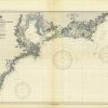 This coastal survey was printed by the U.S. Navy Hydrographic Office in Washington D.C. Details include the names of cities and waterways along the coast. Depth soundings are shown in fathoms. Other details that maybe included are lighthouses and buoy positions.