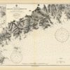This coastal survey was printed by the U.S. Navy Hydrographic Office in Washington D.C. Details include the names of cities and waterways along the coast. Depth soundings are shown in fathoms. Other details that maybe included are lighthouses and buoy positions.