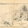 This coastal survey was printed by the U.S. Navy Hydrographic Office in Washington D.C. Details include the names of cities and waterways along the coast. Depth soundings are shown in fathoms. Other details that maybe included are lighthouses and buoy positions.