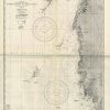 This coastal survey was printed by the U.S. Navy Hydrographic Office in Washington D.C. Details include the names of cities and waterways along the coast. Depth soundings are shown in fathoms. Other details that maybe included are lighthouses and buoy positions.