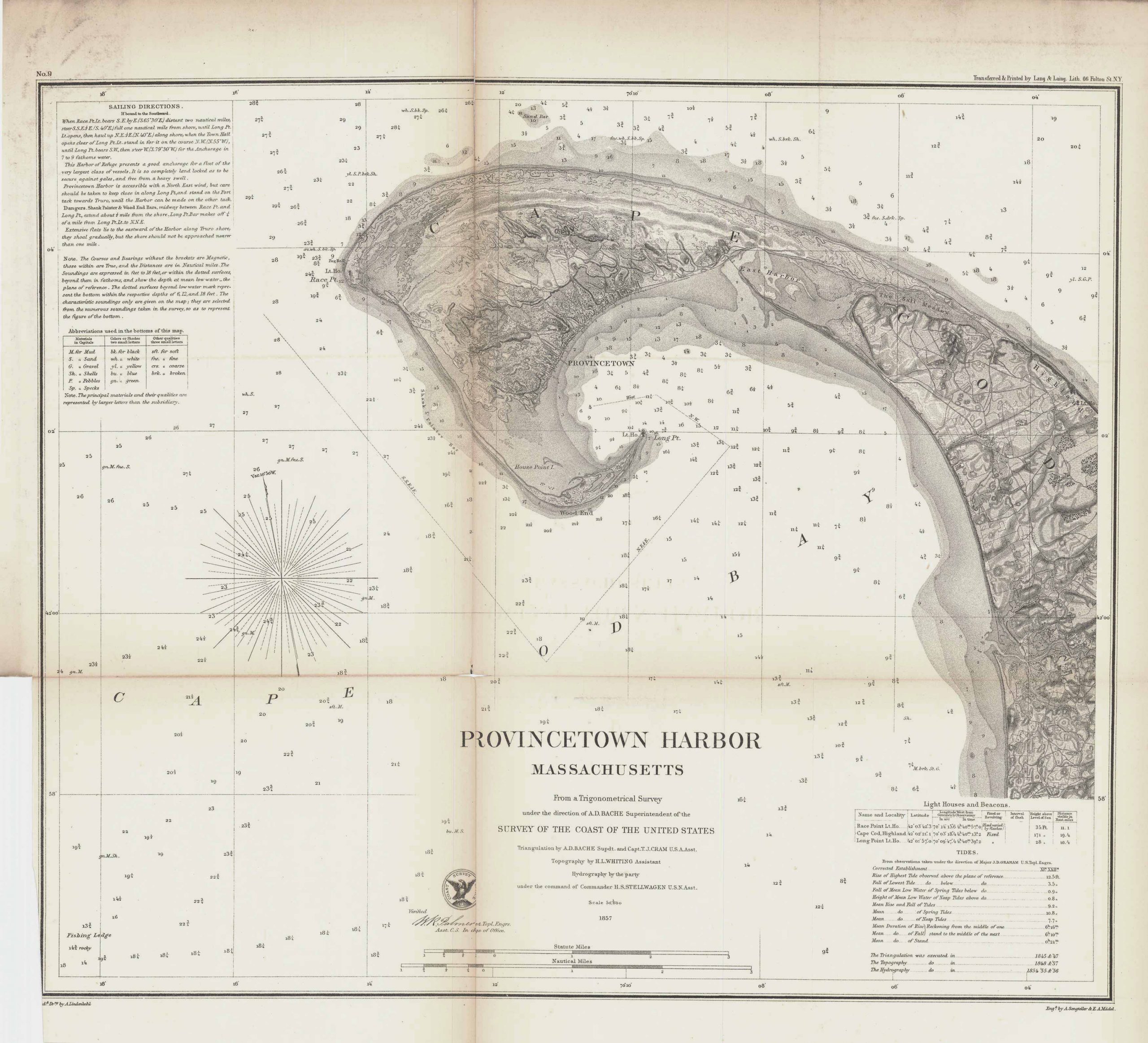 This is an 1857 United States Coastal Survey of Provincetown Harbor, Massachusetts in Cape Cod Bay. Sailing directions, light houses and beacons and topographical features are illustrated and noted. Hand colored and in beautiful condition.