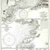 This coastal survey was printed in October 1942 by the U.S. Navy Hydrographic Office in Washington D.C. Details include the names of cities and waterways along the coast. Depth soundings are shown in fathoms. Other details included are lighthouses and bouy positions.