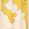 This coastal survey was printed by the U.S. Navy Hydrographic Office in Washington D.C. Details include the names of cities and waterways along the coast. Depth soundings are shown in fathoms. Other details that maybe included are lighthouses and buoy positions.