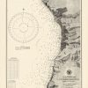 This coastal survey was printed by the U.S. Navy Hydrographic Office in Washington D.C. Details include the names of cities and waterways along the coast. Depth soundings are shown in fathoms. Other details that maybe included are lighthouses and buoy positions.