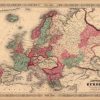 This map is from Johnsons New Illustrated Family Atlas of the World printed in 1868 by A.J. Johnson. Johnson maps are characterized by hand coloring in red and green and distinctive borders, including iron scroll work and a Celtic design. This is a beautiful map of Europe colored in vibrant pastels. The names of countries and major cities are shown. Other details include rail lines, rivers and mountain ranges.
