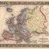 The Mitchell company was one of the first to try out the new technique of engraving on steel plates, experimenting with steel almost 20 years before the rest of the publishing industry. He was printing with steel in the early 1830s; the general switch to steel engraving was approximately 1850. During the early years of the company, Mitchell published mainly maps and travel guides. In 1860, Mitchell started producing “Mitchell’s New General Atlas”. Mitchell Sr. retired and turned the business over to his son of the same name. The New General Atlas was published until 1893. Today Mitchell maps are sought after for their fine engraving, bright coloring, and attention to detail. They are some of the finest maps produced in the 1860’s. This map, produced in 1863, shows Mitchell’s famous flower border, which is only seen in the early editions of his atlases. This map shows Europe.