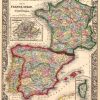 The Mitchell company was one of the first to try out the new technique of engraving on steel plates, experimenting with steel almost 20 years before the rest of the publishing industry. He was printing with steel in the early 1830s; the general switch to steel engraving was approximately 1850. During the early years of the company, Mitchell published mainly maps and travel guides. In 1860, Mitchell started producing “Mitchell’s New General Atlas”. Mitchell Sr. retired and turned the business over to his son of the same name. The New General Atlas was published until 1893. Today Mitchell maps are sought after for their fine engraving, bright coloring, and attention to detail. They are some of the finest maps produced in the 1860’s. This map, produced in 1863, shows Mitchell’s famous flower border, which is only seen in the early editions of his atlases. This map shows France, Spain, and Portugal.