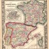 The Mitchell company was one of the first to try out the new technique of engraving on steel plates experimenting with steel almost 20 years before the rest of the publishing industry. He was printing with steel in the early 1830s; the general switch to steel was approximately 1850. During the early years of the company, Mitchell published mainly maps and travel guides. In 1860, Mitchell started producing “Mitchell’s New General Atlas”,and Mitchell Sr. retired and turned the business over to his sonof the same name. The New General Atlas was published until1893. Today Mitchell maps are sought after for their fine engraving, bright coloring, and attention to detail. They aresome of the finest maps produced during this time period. This map produced in 1866, has Mitchell’s unique floral border, and beautiful hand coloring. This map details France, Spain, and Portugal with inset Maps of Switzerland and the Island of Corsica. Countries, cities, towns, lakes, rivers, mountains, and transportation routes are noted. Each map was printed on thick paper with vibrant hand color.