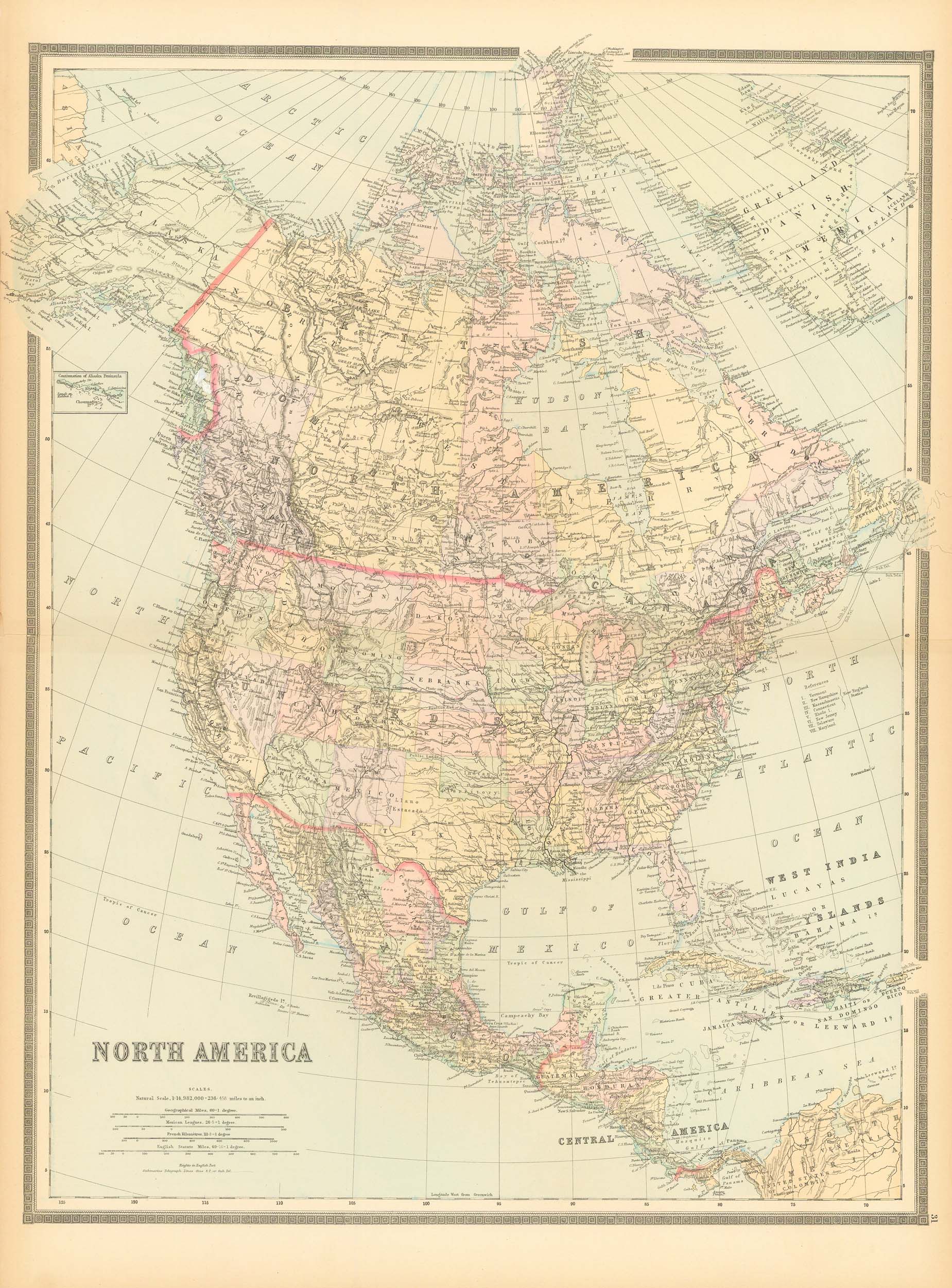 This beautiful, hand colored, steel plate engraved map of North America was made by William Bradley & Bros. in 1889. Pastel color distinguishes regions on this very detailed map from the hard to find map-maker. Countries, states, important cities, rivers, lakes, and mountain ranges are identified on the map.