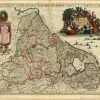 Elaborately and beautifully decorated map of the XVII Provinces of Netherlands and Belgium with the west on top. Decorative cartouche topped with a rampant lion with a sword. At the bottom of the cartouche there is the crest of Johan Munter. Munster was a wealthy merchant in Amsterdam whom held several posts of honour in Amsterdam. He became commissioner of the exchange bank, he was ‘Schepen’ [city councillor], was a member of the governing body of the V.O.C. and finally became major of the city.