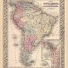 This hand colored map was made in 1877 by S. Augustus Mitchell for “Mitchells New General Atlas”. South America is illustrated on this map. An inset shows canal routes along the coast of New Granada. Countries are distinguished by color. Other details include the names of Countries and important cities, and illustrations of mountains, rivers, and lakes.