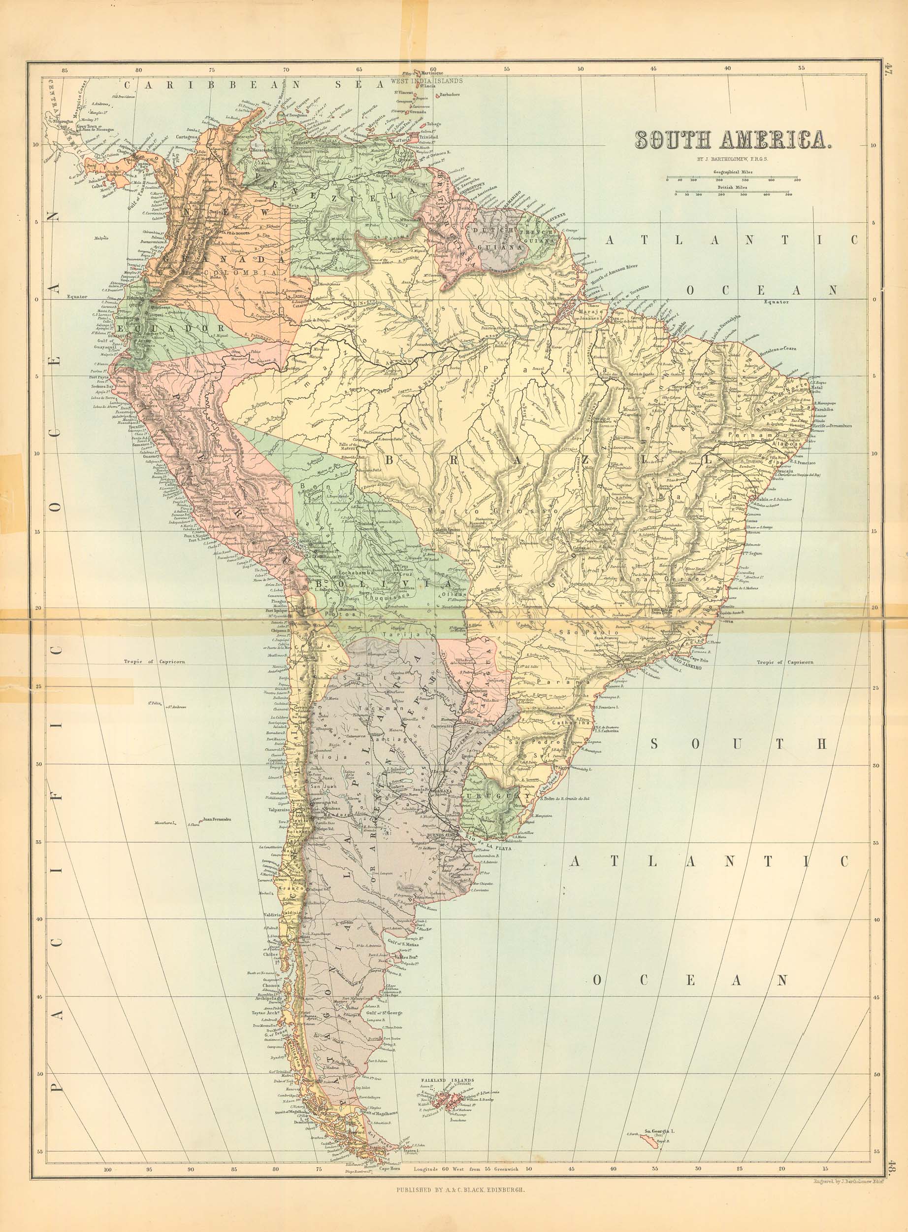 This beautiful map of South America was printed in Edinburgh by Adam and Charles Black for “Black’s General Atlas of the World,” published in 1885. Details include identification of regions, important cities, railroads, major roads, rivers, lakes, and mountains. This map is in good condition with bright, crisp color, and is printed on heavier paper stock then is customary on maps from this period.