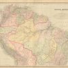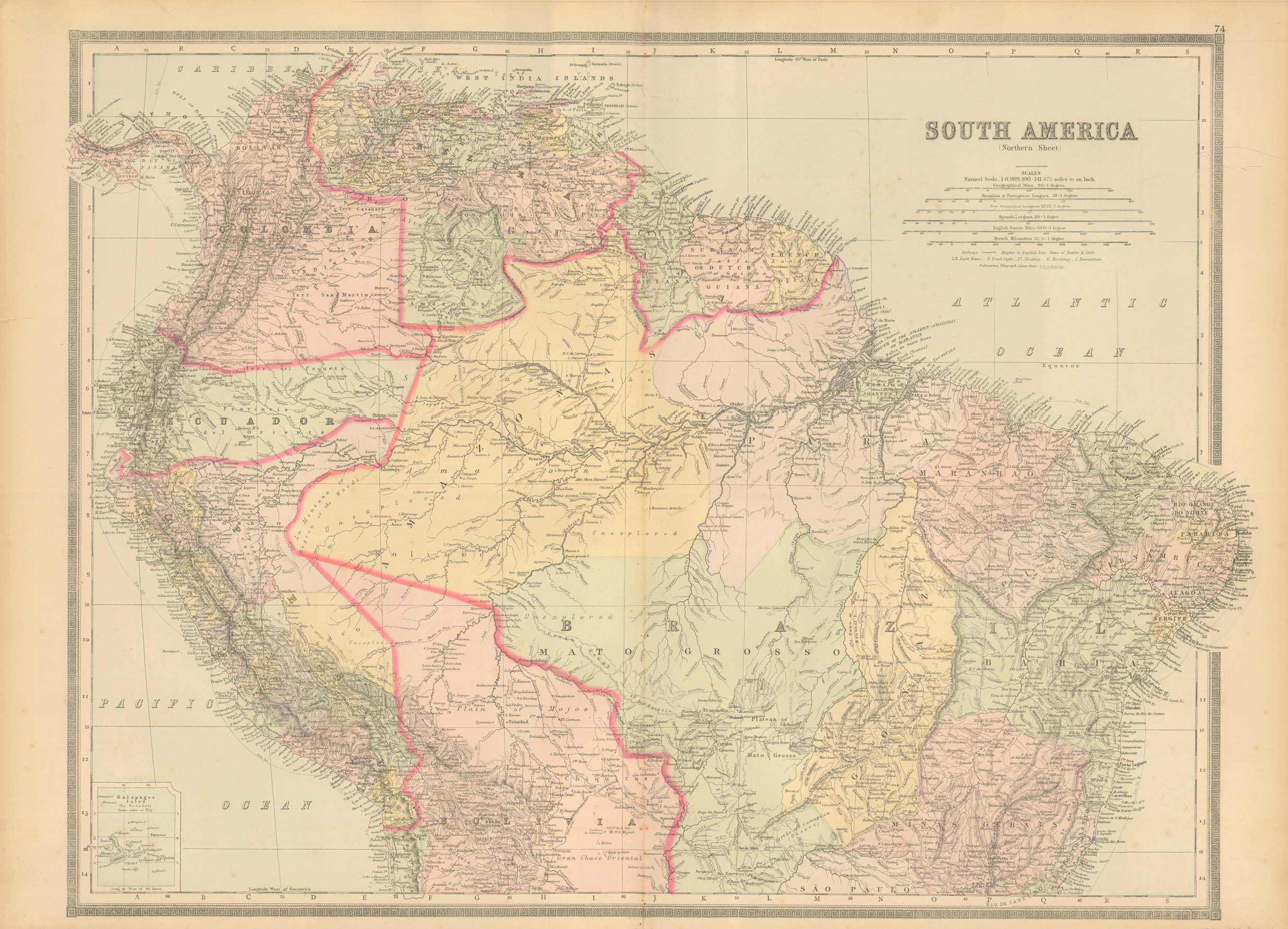 This beautiful, hand colored, steel plate engraved, map of northern South America was made by William Bradley & Bros. in 1889. Pastel color distinguishes regions on this very detailed map from the hard to find atlas. Countries, important cities, rivers, lakes, and mountain ranges are identified on the map. The Galapagos Islands are shown in an inset.