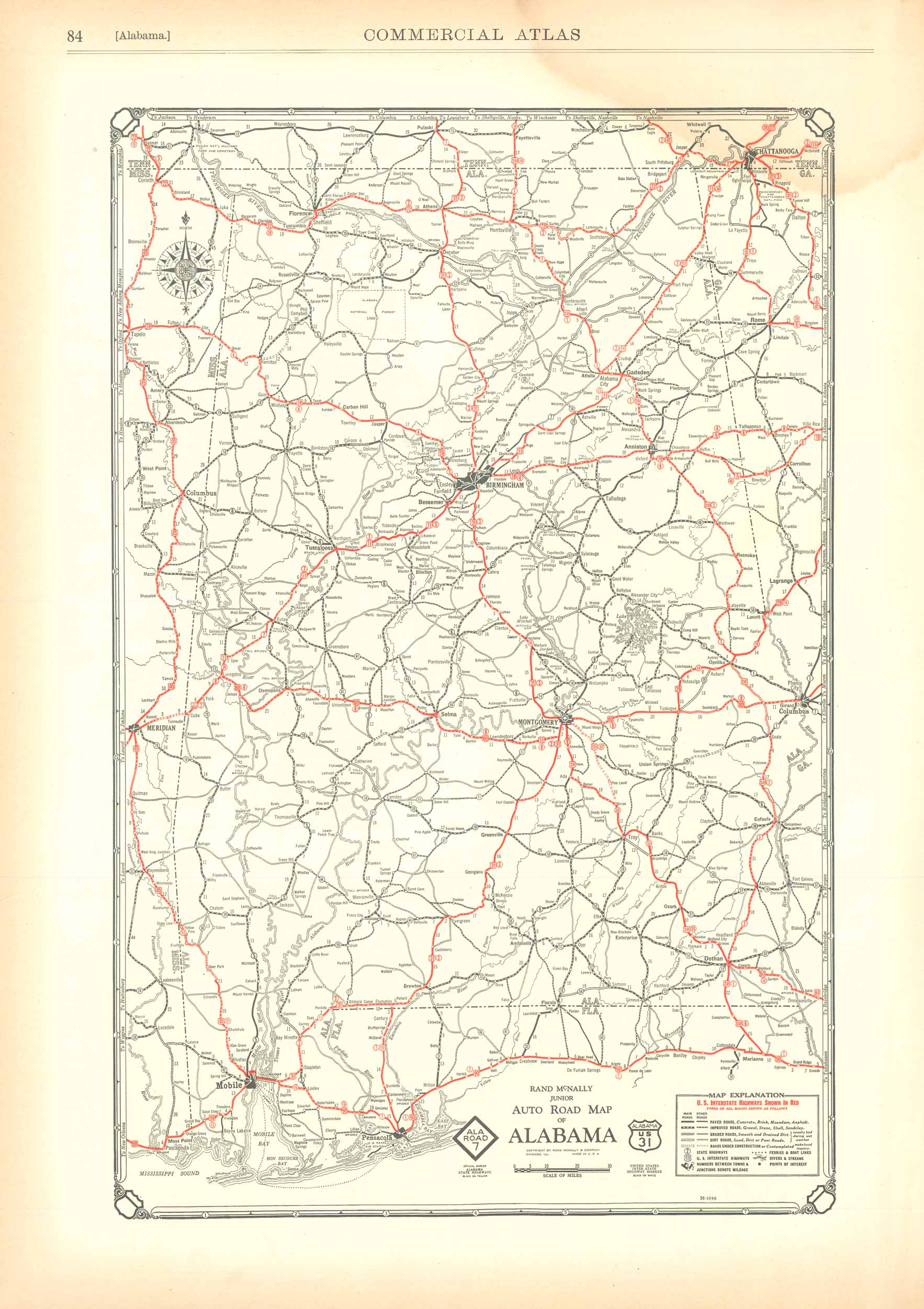 Rand McNally & Company, still a major name in map publishing to this day, began as a small print shop opened in Chicago in 1856 by William H. Rand. The shop originally printed guidebooks and directories. In 1858, Rand hired Andrew McNally who was later to become a partner. Within the next few years, the shop got into the railroad business by starting to print railway tickets and schedules, a key step in the development of the company. The ticket printing led to the publishing of railway guides, and by 1872 Rand McNally and Company had the capacity to publish maps. This map of Alabama came from Rand McNallys Commercial Atlas. A highly successful run of atlases that lasted over a decade. These maps were primarily used by business, because of their accurate listing of railroads in operation as well as tables of statistical information. This map is unique in several ways, their large format makes an impressive display, and offers additional room where many small towns and extra details are included. Additionally a list of every railroad operating in the state in 1932 is included. All railroad routes are shown on the map. This map includes all cities and towns, lakes, rivers, and bodies of water. All topographical features are also included as well as political features such as counties and Native American Indian reservations.